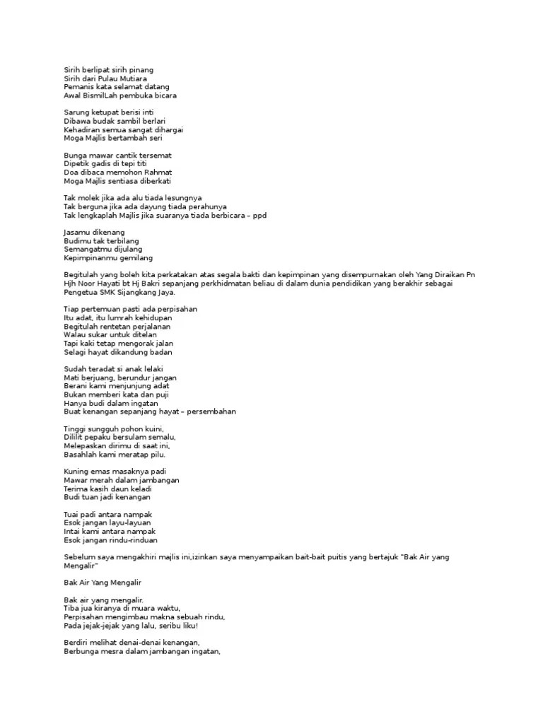 Dalam sesuatu majlis formal seperti majlis jamuan, majlis perpisahan, majlis persaraan, perhimpunan bulanan pekerja sektor awam dan sebagainya, pantun kerap . 15 rangkap pantun klasik yang bertemakan perpisahan. Mengungkapkan pantun buat sahabat tersayang bisa menjadi lentera kecil yang. Bekerja tidak hanya bertujuan mencari uang yang banyak . Setiap ada pertemuan pasti ada perpisahan. Seorang teman minta karangkan pantun perpisahan untuk rakan sejawat yang akan bersara. Ucapan perpisahan kerja, perpisahan kerja, kata perpisahan kerja, kata kata perpisahan kerja, video ucapan perpisahan kerja, .